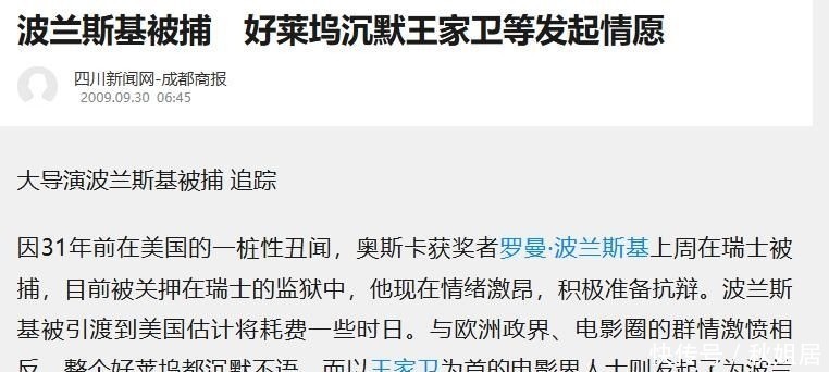 2009年,涉嫌迷奸13岁少女并长期潜逃的波兰斯基在瑞士被捕。