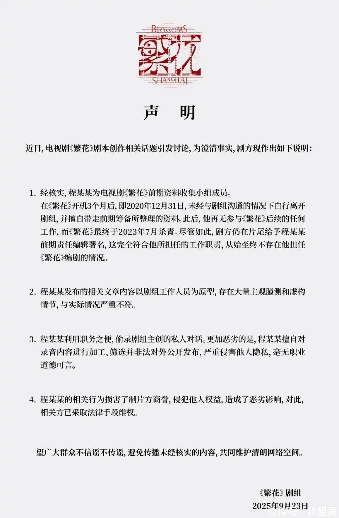 《繁花》官方仅发布一份模棱两可的声明,既未否认录音真实性,也无法提供有效反驳证据。