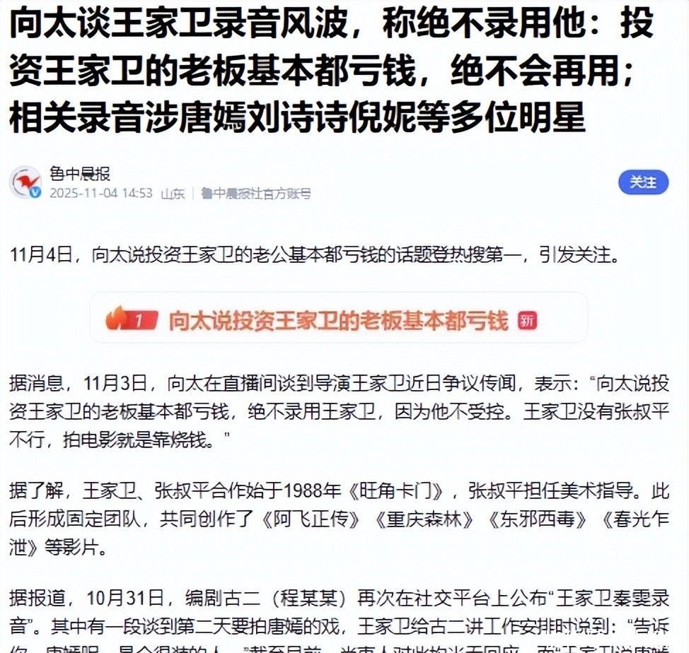 向太谈王家卫录音风波,称绝不录用他:投资王家卫的老板基本都亏钱,绝不会再用;相关录音涉唐嫣刘诗诗倪妮等多位明星.鲁中晨报.2025-11-04